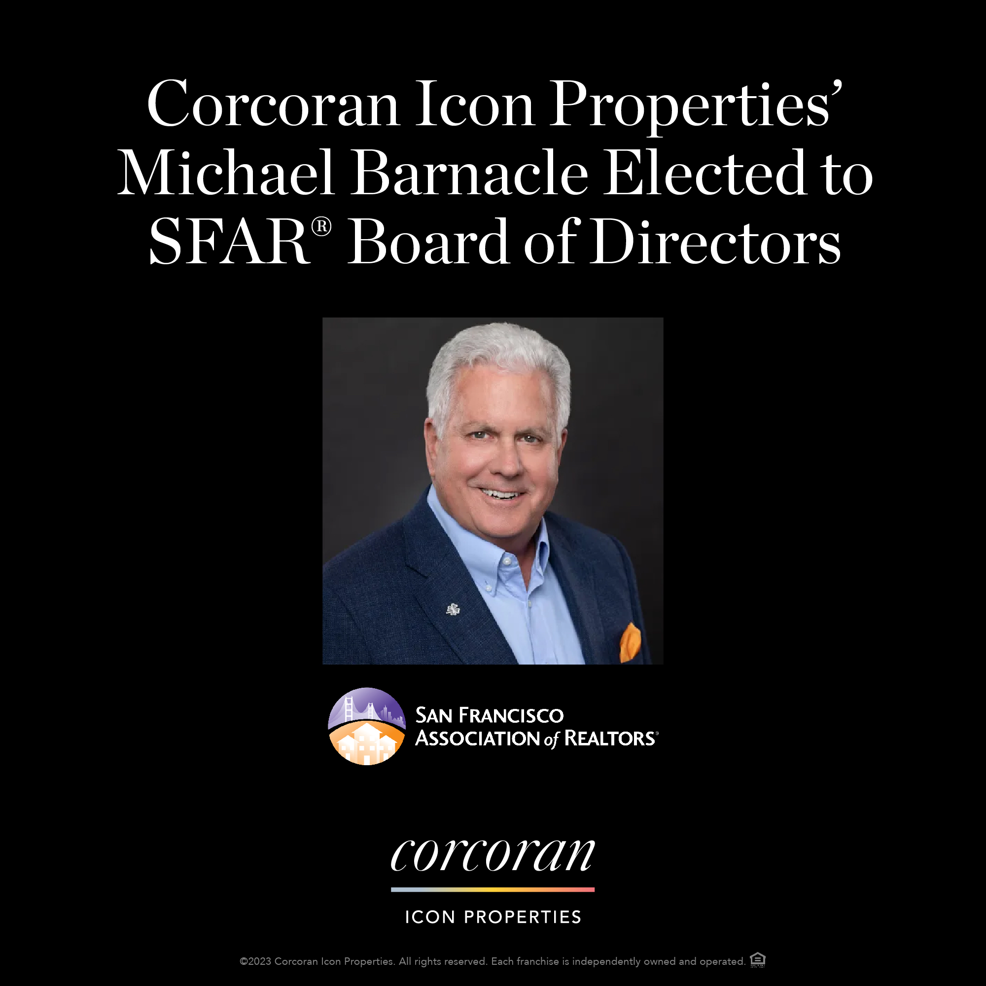 Michael Barnacle, Managing Broker and Partner at Corcoran Icon Properties has been elected to the San Francisco Association of REALTORS® Board of Directors for the term commencing January 1, 2024, along with three other REALTOR® members. Directors’ elections are held annually to replace outgoing directors completing their terms of office.